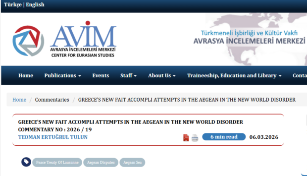 Την επαναφορά της συζήτησης για το καθεστώς των νησιών του ανατολικού Αιγαίου επιχειρεί το τελευταίο διάστημα το AVİM, ένα από τα τουρκικά think tanks που δραστηριοποιούνται στον χώρο της διεθνούς πολιτικής ανάλυσης και παρεμβαίνουν συστηματικά σε ζητήματα εξωτερικής πολιτικής.