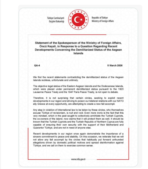 Η προσέγγιση αυτή αντανακλά τη γνωστή θέση της τουρκικής πλευράς ότι η στρατιωτική παρουσία στα νησιά του ανατολικού Αιγαίου πρέπει να εξετάζεται υπό το πρίσμα των διεθνών συμφωνιών που καθόρισαν το καθεστώς τους. Η ελληνική πλευρά, ωστόσο, απορρίπτει αυτή την ερμηνεία. Η Αθήνα επισημαίνει ότι η Συνθήκη των Παρισίων, η οποία ρυθμίζει το καθεστώς των Δωδεκανήσων, υπογράφηκε μεταξύ της Ιταλίας και των Συμμάχων μετά τον Β΄ Παγκόσμιο Πόλεμο, με την Τουρκία να μην αποτελεί συμβαλλόμενο μέρος της συμφωνίας. Επιπλέον, η Ελλάδα υποστηρίζει ότι η στρατιωτική παρουσία στα νησιά συνδέεται με λόγους άμυνας και απορρέει από το δικαίωμα αυτοάμυνας που προβλέπει το άρθρο 51 του Καταστατικού Χάρτη των Ηνωμένων Εθνών.