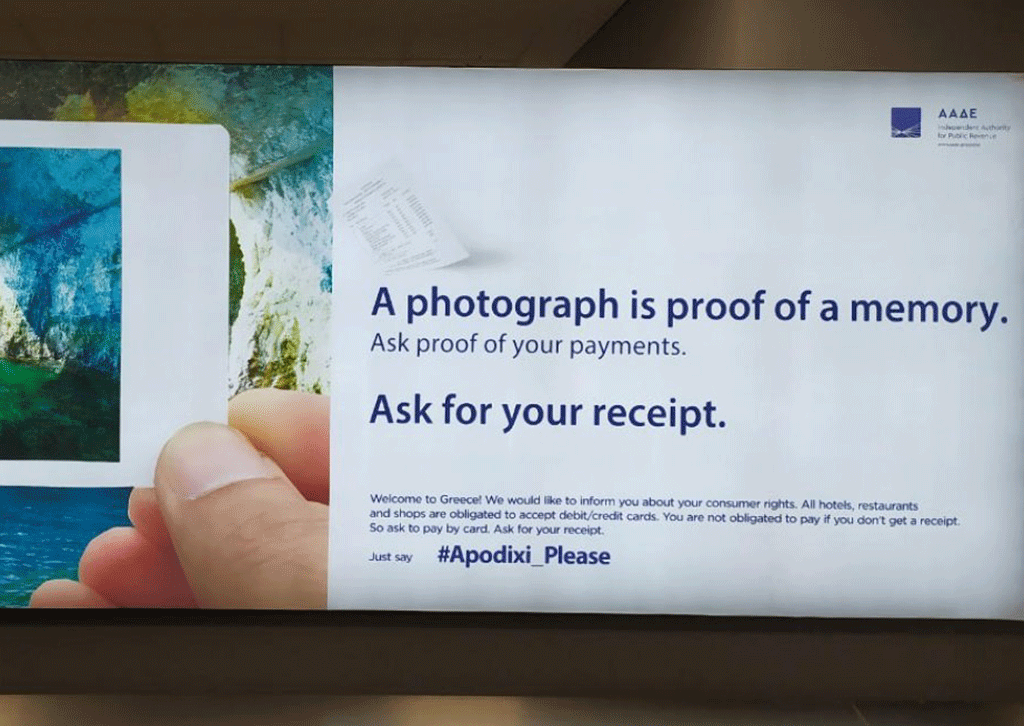 «Μια φωτογραφία είναι απόδειξη μιας ανάμνησης. Ζητήστε απόδειξη για τις πληρωμές σας. Καλωσορίσατε στην Ελλάδα! Θέλουμε να σας ενημερώσουμε για τα δικαιώματά σας ως καταναλωτές. Όλα τα ξενοδοχεία, εστιατόρια και καταστήματα είναι υποχρεωμένα να δέχονται χρεωστικές/πιστωτικές κάρτες. Δεν είστε υποχρεωμένοι να πληρώσετε εάν δεν πάρετε απόδειξη. Συνεπώς, ζητήστε να πληρώσετε με κάρτα. Ζητήστε την απόδειξή σας. Απλά πείτε #Apodixi_Please».