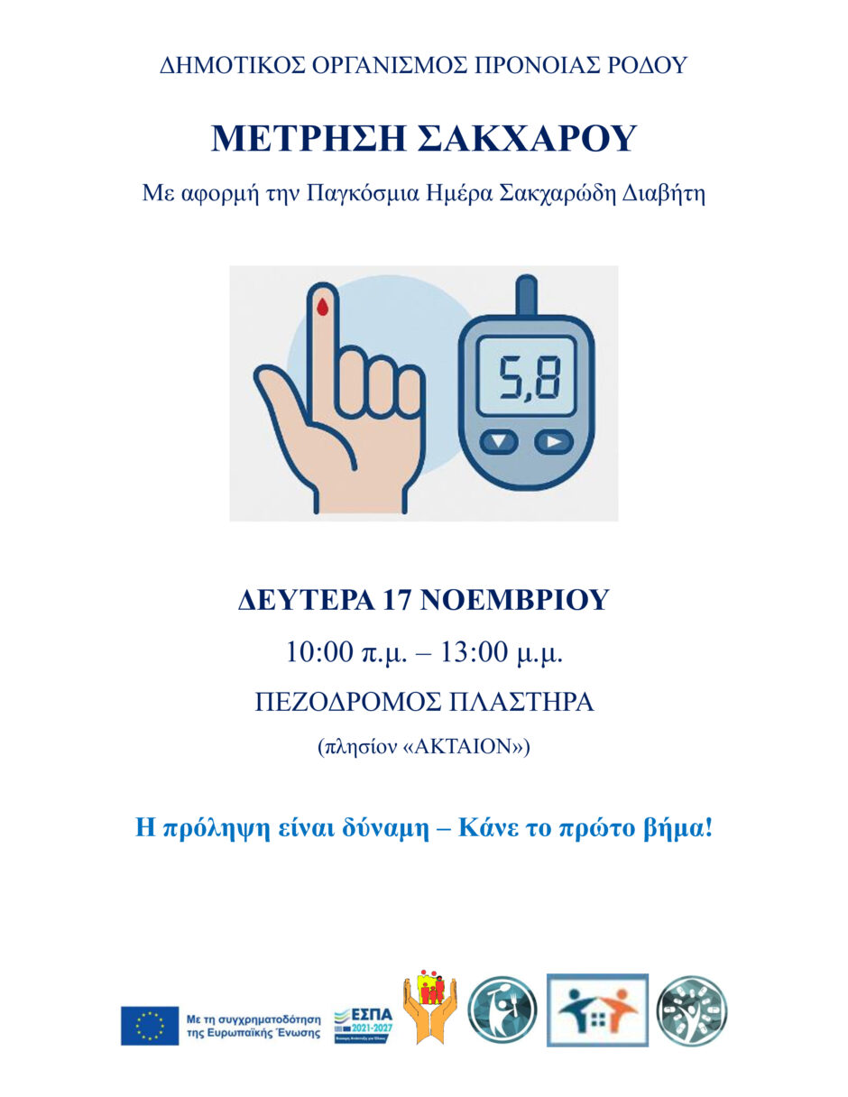 Με αφορμή την Παγκόσμια Ημέρα Διαβήτη στις 14 Νοεμβρίου, ο Δημοτικός Οργανισμός Πρόνοιας Δήμου Ρόδου, μέσω των Κοινωνικών του Υπηρεσιών και με παρότρυνση του Αντιδημάρχου Κοινωνικής Πολιτικής, Αλληλεγγύης και Ισότητας κύριου Θωμά Σωτρίλλη, διοργανώνει δράση δωρεάν μέτρησης σακχάρου για όλους τους πολίτες.