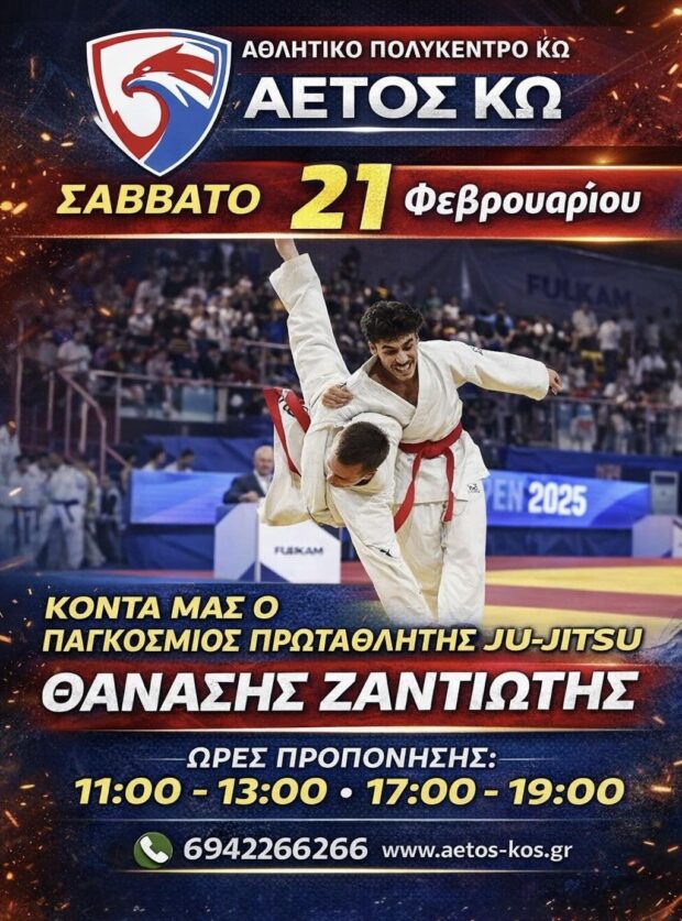 «Στην Κω θα βρεθεί το Σάββατο 21 Φεβρουαρίου ο παγκόσμιος πρωταθλητής Ju-Jitsu Θανάσης Ζαντιώτης, στο πλαίσιο ειδικής προπονητικής δράσης υψηλού επιπέδου, με στόχο την αγωνιστική και τεχνική εξέλιξη των αθλητών του νησιού.