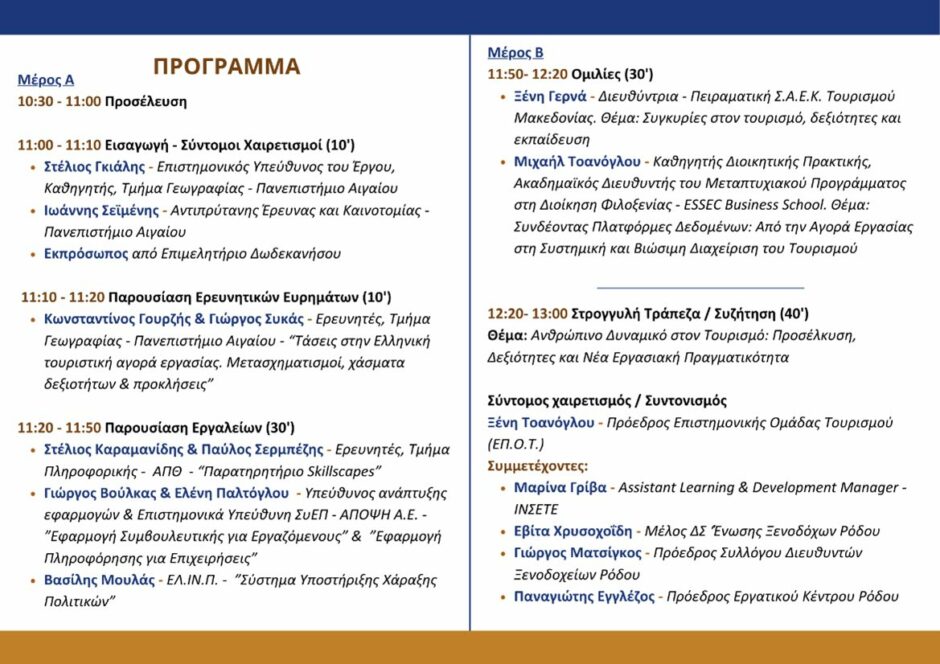 Ιδιαίτερη έμφαση θα δοθεί στην παρουσίαση πρακτικών εργαλείων και εφαρμογών που αναπτύχθηκαν στο πλαίσιο του έργου, τα οποία δεν περιορίζονται μόνο σε ερευνητική χρήση, αλλά μπορούν να αξιοποιηθούν από εργαζόμενους, επιχειρήσεις και φορείς για την καλύτερη κατανόηση και διαχείριση της τουριστικής αγοράς εργασίας, καθώς και για τη χάραξη πολιτικών. Η εκδήλωση θα ολοκληρωθεί με συζήτηση μεταξύ ειδικών, εκπροσώπων του τουριστικού κλάδου και της εκπαίδευσης, με στόχο την ανταλλαγή απόψεων και τη διαμόρφωση προτάσεων για το μέλλον. Μέσα από αυτή τη διαδικασία, επιδιώκεται η ανάδειξη ρεαλιστικών λύσεων που θα συμβάλουν στη βιώσιμη ανάπτυξη του τουρισμού και στη στήριξη των ανθρώπων που εργάζονται σε αυτόν.