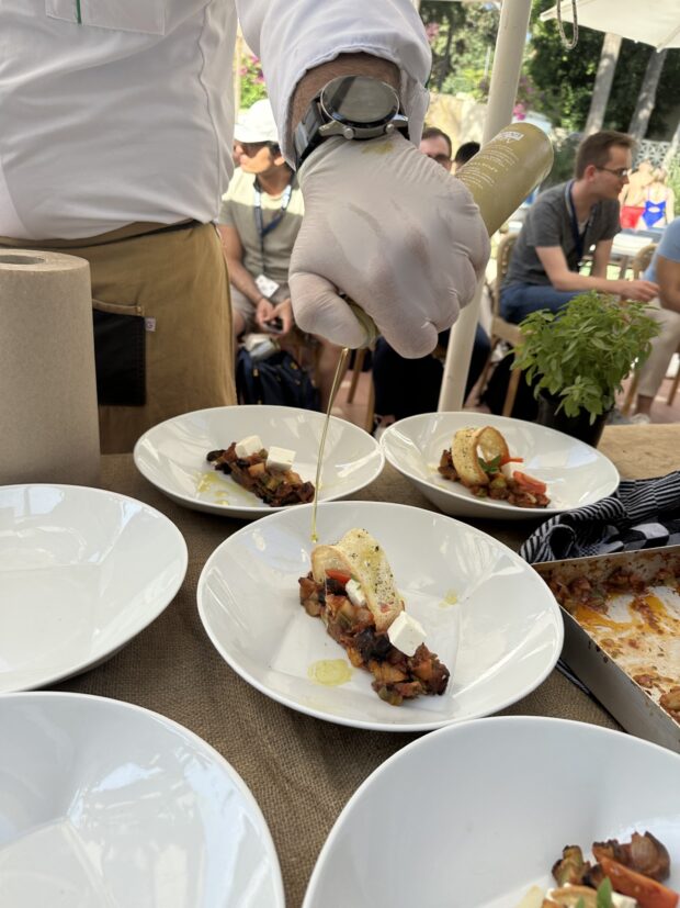 Οι παραδοσιακές συνταγές σε δημιουργική απόδοση είναι οι πρωταγωνιστές της γνωριμίας με το νησί και τη χώρα μας προσφέροντας μοναδική εμπειρία. Οι συμμετέχοντες επιστήμονες στα δύο μαθήματα που οργανώθηκαν, ενθουσιάστηκαν και δοκίμασαν όλα τα πιάτα και μία και δύο φορές. Η γνωριμία με τα αγνά εποχικά προϊόντα υψηλής ποιότητας, οι πληροφορίες για τα βότανα, η αναλυτική ενημέρωση για το ελαιόλαδο, το γιαούρτι, τη φέτα και τα χαρακτηριστικά τους δίνουν την ευκαιρία στην επιλογή τους από τους συμμετέχοντες στον τόπο κατοικίας τους στο εξωτερικό. Πολλές οι ερωτήσεις για τα υλικά και την ελληνική κουζίνα, την υγεία και καλή φυσική κατάσταση στη σύγχρονη ζωή. Η απόλαυση του φαγητού στη συνέχεια, οι συνταγές που δόθηκαν στους συμμετέχοντες, μετέτρεψαν τα μαθήματα σε γιορτή γεύσης.