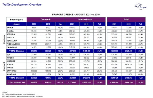 Από την σύγκριση προκύπτει, ότι ο φετινός Αύγουστος, “υπολείπεται” κατά 18,5% του αντιστοίχου μήνα του 2019, σε σύνολο αφίξεων, εσωτερικού και εξωτερικού.