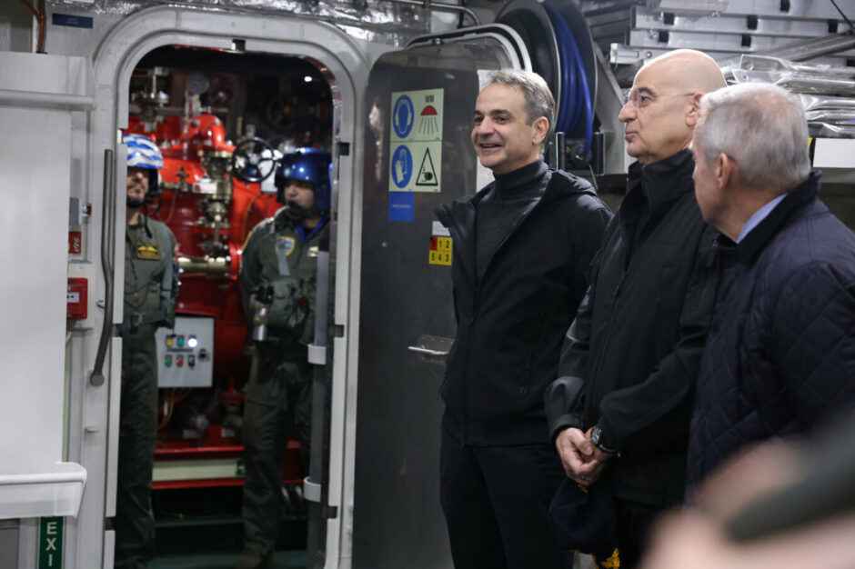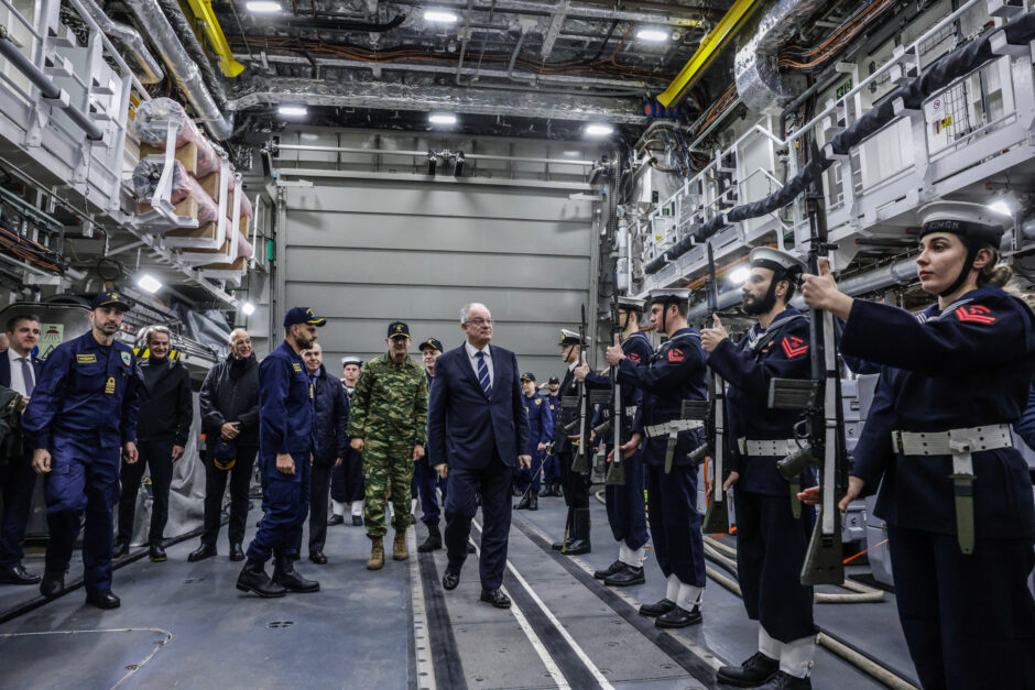 Ο πρόεδρος της Δημοκρατίας,  Κωνσταντίνος Τασούλας, ο πρωθυπουργός, Κυριάκος Μητσοτάκης, και ο υπουργός Εθνικής Άμυνας, Νίκος Δένδιας, προσγειώθηκαν στη φρεγάτα Belharra, δίνοντας από την πρώτη στιγμή τον τόνο μιας τελετής με έντονο θεσμικό χαρακτήρα και σαφή πολιτική βαρύτητα.