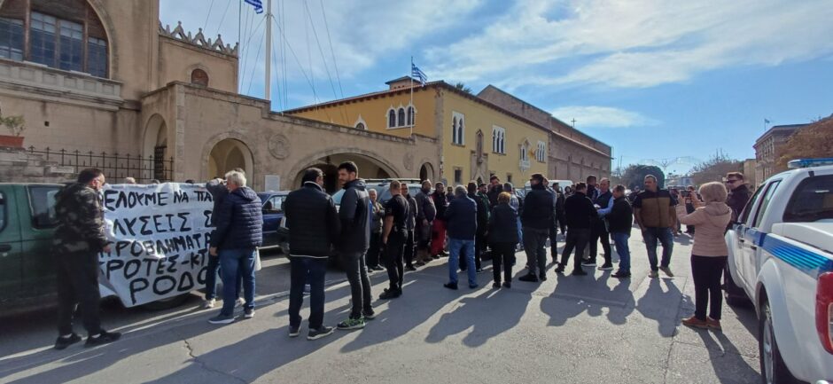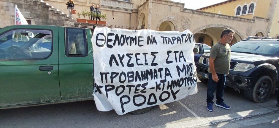 Στο κέντρο της πόλεως κατέβηκαν  αγρότες κτηνοτρόφοι και μελισσοκόμοι  της Ρόδου στα πλαίσια της κινητοποίησης που έχουν αποφασίσει να κάνουν. Παρέταξαν τα αγροτικά τους στην πλατεία δημαρχείου και συναντώνται με τον Περιφερειάρχη Νοτίου Αιγαίου κ. Γιώργο Χατζημάρκο και με το δήμαρχο Ρόδου κ. Αλέξανδρο Κολιάδη.