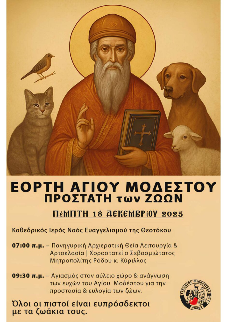 Την Πέμπτη, 18 Δεκεμβρίου 2025, η Εκκλησία μας τιμά τη μνήμη του Αγίου Ιερομάρτυρος Μοδέστου, Αρχιεπισκόπου Ιεροσολύμων και προστάτη των ζώων.