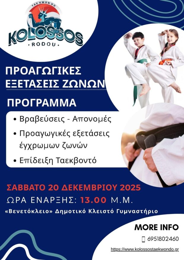 «Σας ενημερώνουμε ότι η ώρα έναρξης των Προαγωγικών Εξετάσεων Ζωνών του συλλόγου μας, το Σάββατο 20 Δεκεμβρίου 2025, μεταφέρεται από τις 14:00, στις 13:00.