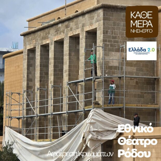 Η απομάκρυνση των ικριωμάτων από το Εθνικό Θέατρο Ρόδου σηματοδοτεί ένα ορατό και συμβολικό βήμα στην πορεία αποκατάστασης του εμβληματικού μνημείου της πόλης. Με ανάρτησή του, ο περιφερειάρχης Νοτίου Αιγαίου και πρόεδρος της ΕΝΠΕ Γιώργος Χατζημάρκος έκανε λόγο για «κιβωτό μνήμης» και «κόσμημα του νησιού», τονίζοντας ότι το θέατρο «επιστρέφει με την όψη και την αίγλη που του αξίζει». Η εξέλιξη αυτή έρχεται σε συνέχεια της υπογραφής, τον Ιούνιο του 2023, της εργολαβικής σύμβασης ύψους 17.191.422,74 ευρώ για την πλήρη αποκατάσταση και επαναλειτουργία του θεάτρου. Την σύμβαση υπέγραψαν η Περιφέρεια Νοτίου Αιγαίου, ο Δήμος Ρόδου και η ανάδοχος εταιρεία, επισφραγίζοντας μια διαδικασία που ουσιαστικά έβαλε τέλος σε έναν μεταπολιτευτικό κύκλο ημιτελών έργων και εργοταξίων-«φαντασμάτων» που για δεκαετίες ταλαιπωρούσαν το μνημείο.