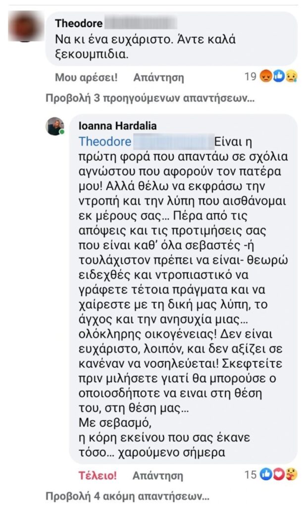 Η Ιωάννα Χαρδαλιά, κόρη του υφυπουργού Πολιτικής Προστασίας, απάντησε σε σχόλιο χρήστη του διαδικτύου που φαίνεται πως χάρηκε με την περιπέτεια υγείας του υφυπουργού Πολιτικής Προστασίας.