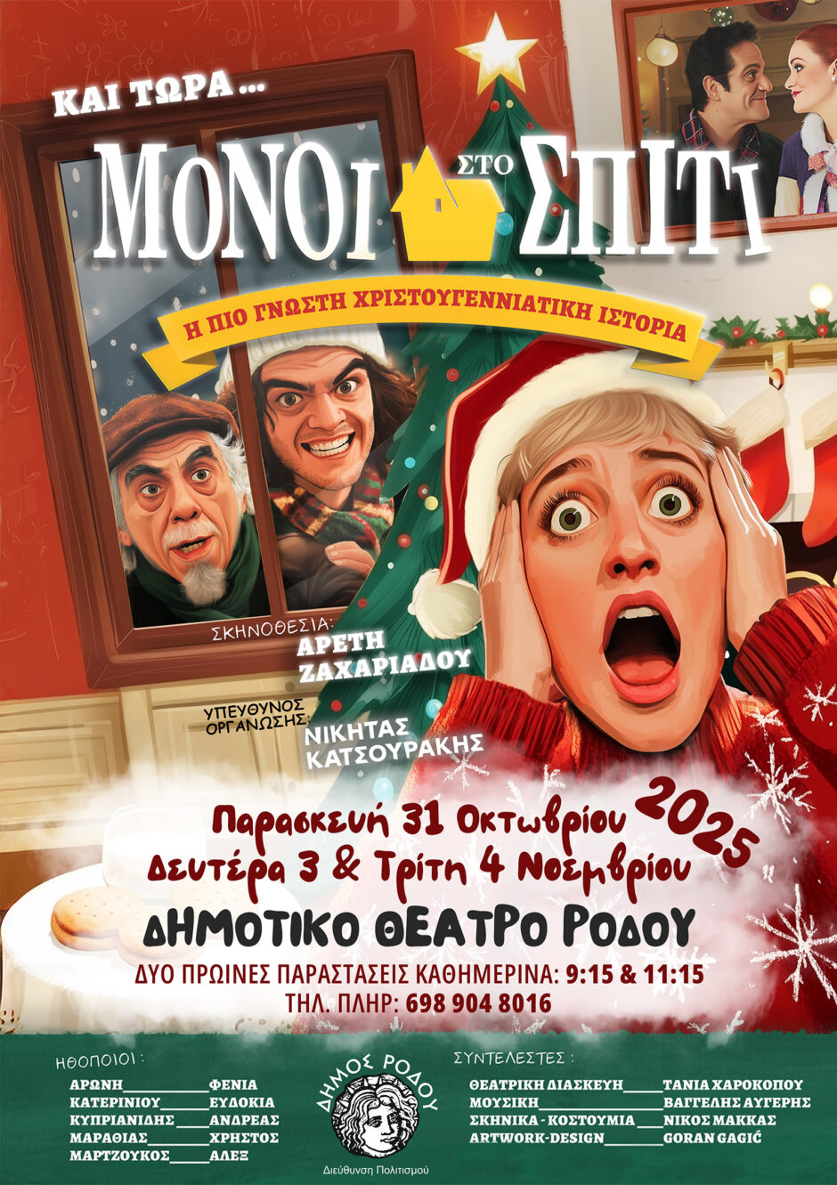 Ο Καλλιτεχνικός Οργανισμός Τέχνης και Δρώμενα, σε συνεργασία με τις Πρότυπες ΘεατροΧορευτικές Παραγωγές Ν.Κ. (Νικήτας Κατσουράκης), παρουσιάζουν για δεύτερη χρονιά τη θεατρική μεταφορά της γνωστής Χριστουγεννιάτικης ταινίας «Και τώρα… Μόνοι στο Σπίτι (Home Alone)». Η περσινή Χριστουγεννιάτικη παράσταση-φαινόμενο, που προσέλκυσε περισσότερους από 60.000 θεατές μέσα σε μόλις τρεις μήνες, επιστρέφει δυναμικά, ενθουσιάζοντας ξανά μικρούς και μεγάλους.