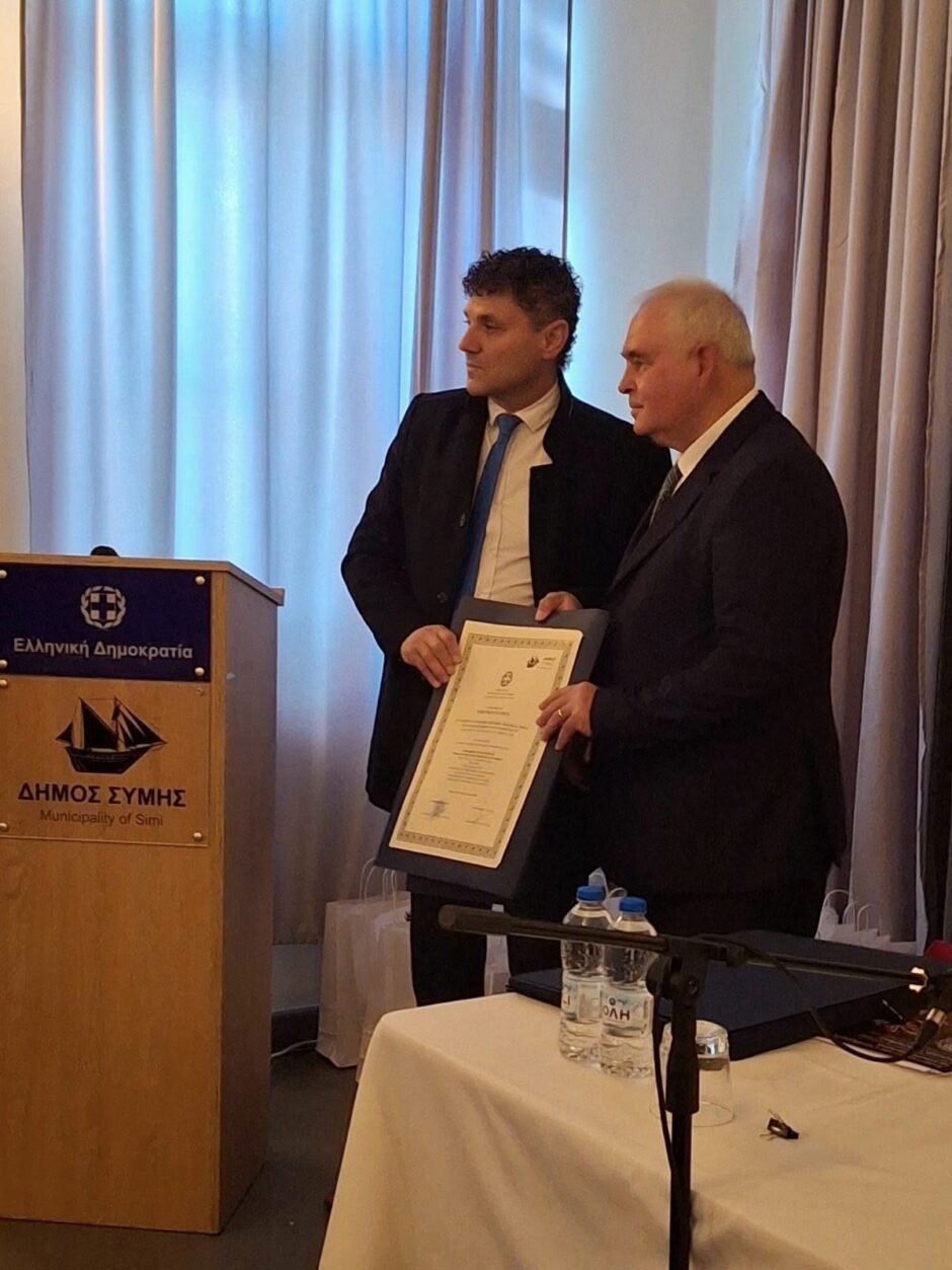 κατόπιν απόφασης του Δημοτικού Συμβουλίου Σύμης, για τη γενναιόδωρη προσφορά του και τη διαχρονική στήριξή του σε δράσεις που προάγουν τον πολιτισμό, την ιστορική μνήμη και την επιστημονική γνώση.