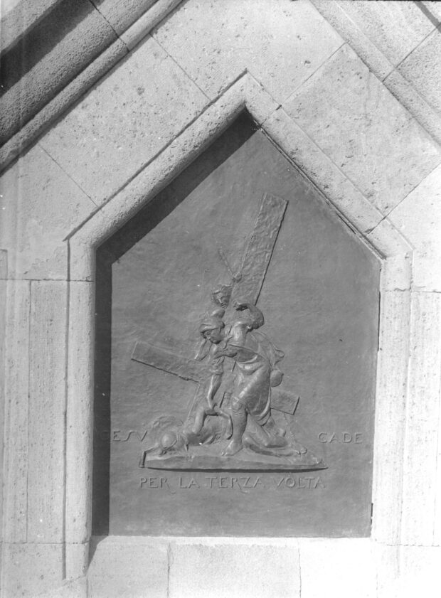 Τα ανάγλυφα των Σταθμών του Πάθους συνδέονται με τον Ιταλό γλύπτη Antonio Maraini (Ρώμη, 5 Απριλίου 1886 – Φλωρεντία, 23 Μαΐου 1963). Το 1925, κατά την περίοδο του Μεσοπολέμου και ενώ η Ρόδος τελούσε υπό ιταλική κατοχή, ο Maraini έλαβε παραγγελία για την κατασκευή δεκατεσσάρων αναγλύφων από πέτρα του Arezzo, με την απεικόνιση των Σταθμών του Πάθους (Via Crucis), προορισμένων για τον τότε Καθεδρικό Ναό του Αγίου Ιωάννη της Ρόδου, τον σημερινό Ευαγγελισμό. Τρία από τα πέτρινα ανάγλυφα εκτέθηκαν το 1926 στη Μπιενάλε της Βενετίας, ενώ το σύνολο παρουσιάστηκε το 1927 στην Galleria d’Arte Antica, στο Palazzo Feroni της Φλωρεντίας.