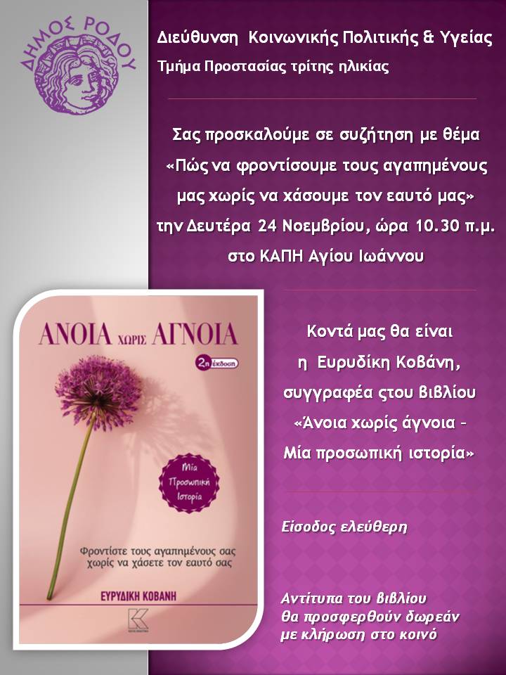 Το ΚΑΠΗ Δήμου Ρόδου διοργανώνει τη Δευτέρα 24 Νοεμβρίου, στις 10:30π.μ. ανοιχτή συζήτηση με αφορμή το βιβλίο της Ευρυδίκης Κοβάνη «Άνοια χωρίς άγνοια – Μια προσωπική ιστορία», ένα εγχειρίδιο γραμμένο για οικογενειακούς φροντιστές ατόμων με άνοια.