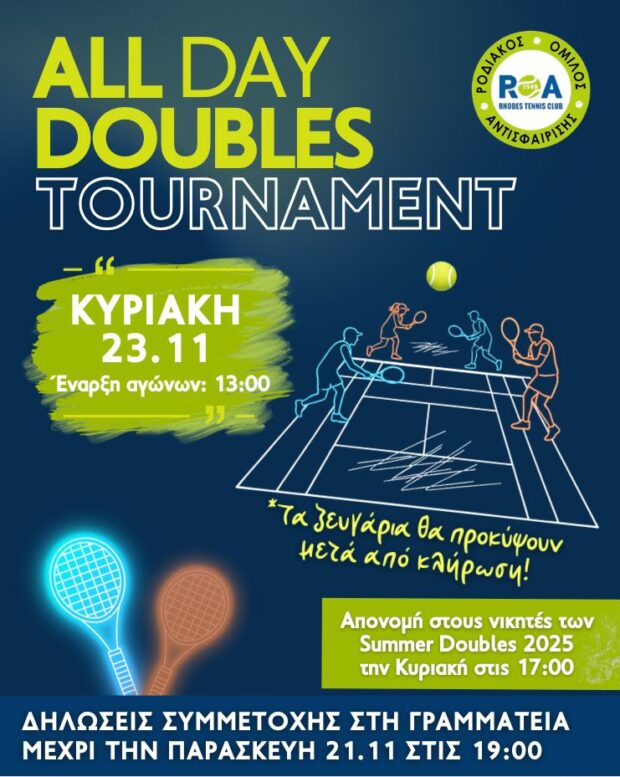 Την προσεχή Κυριακή 23 Νοεμβρίου θα διεξαχθεί από τον Ροδιακό Όμιλο Αντισφαίρισης το «All Day Doubles».