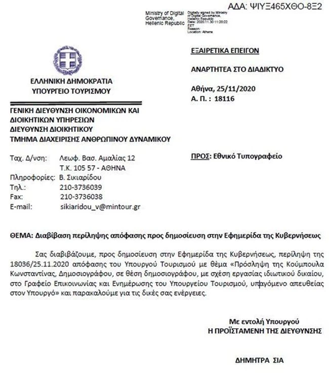 Όπως αναφέρεται χαρακτηριστικά στην απόφαση με ημερομηνία 25 Νοεμβρίου που αναρτήθηκε στη “Διαύγεια”: “Σας διαβιβάζουμε, προς δημοσίευση στην Εφημερίδα της Κυβερνήσεως, περίληψη της 18036/25.11.2020 απόφασης του Υπουργού Τουρισμού με θέμα “Πρόσληψη της Κούμπουλα Κωνσταντίνας, Δημοσιογράφου, σε θέση δημοσιογράφου, με σχέση εργασίας ιδιωτικού δικαίου, στο Γραφείο Επικοινωνίας και Ενημέρωσης του Υπουργείου Τουρισμού, υπαγόμενο απευθείας στον Υπουργό” και παρακαλούμε για τις δικές σας ενέργειες”.