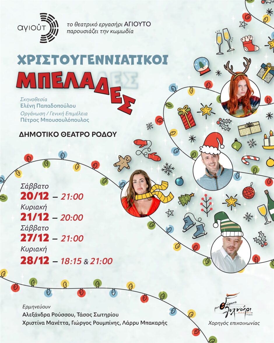 Το Θεατρικό Εργαστήρι ΑΓΙΟΥΤΟ παρουσιάζει στη Ρόδο την κωμωδία «ΧΡΙΣΤΟΥΓΕΝΝΙΑΤΙΚΟΙ ΜΠΕΛΑΔΕΣ», μια χριστουγεννιάτικη παράσταση για όλη την οικογένεια, γεμάτη γέλιο, ανατροπές και σύγχρονους προβληματισμούς.