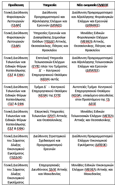 Η νέα Γενική Διεύθυνση προκύπτει από τη μετεξέλιξη της μέχρι σήμερα Γενικής Διεύθυνσης του Σώματος Δίωξης Οικονομικού Εγκλήματος (ΓΔΣΔΟΕ) και ενισχύεται σημαντικά με τη μεταφορά σε αυτή ελεγκτικών μονάδων από τη Γενική Διεύθυνση Φορολογικών Λειτουργιών (ΓΔΦΛ) και τη Γενική Διεύθυνση Τελωνείων και Ειδικών Φόρων Κατανάλωσης (ΓΔΤ & ΕΦΚ), όπως αποτυπώνεται στον ακόλουθο πίνακα: