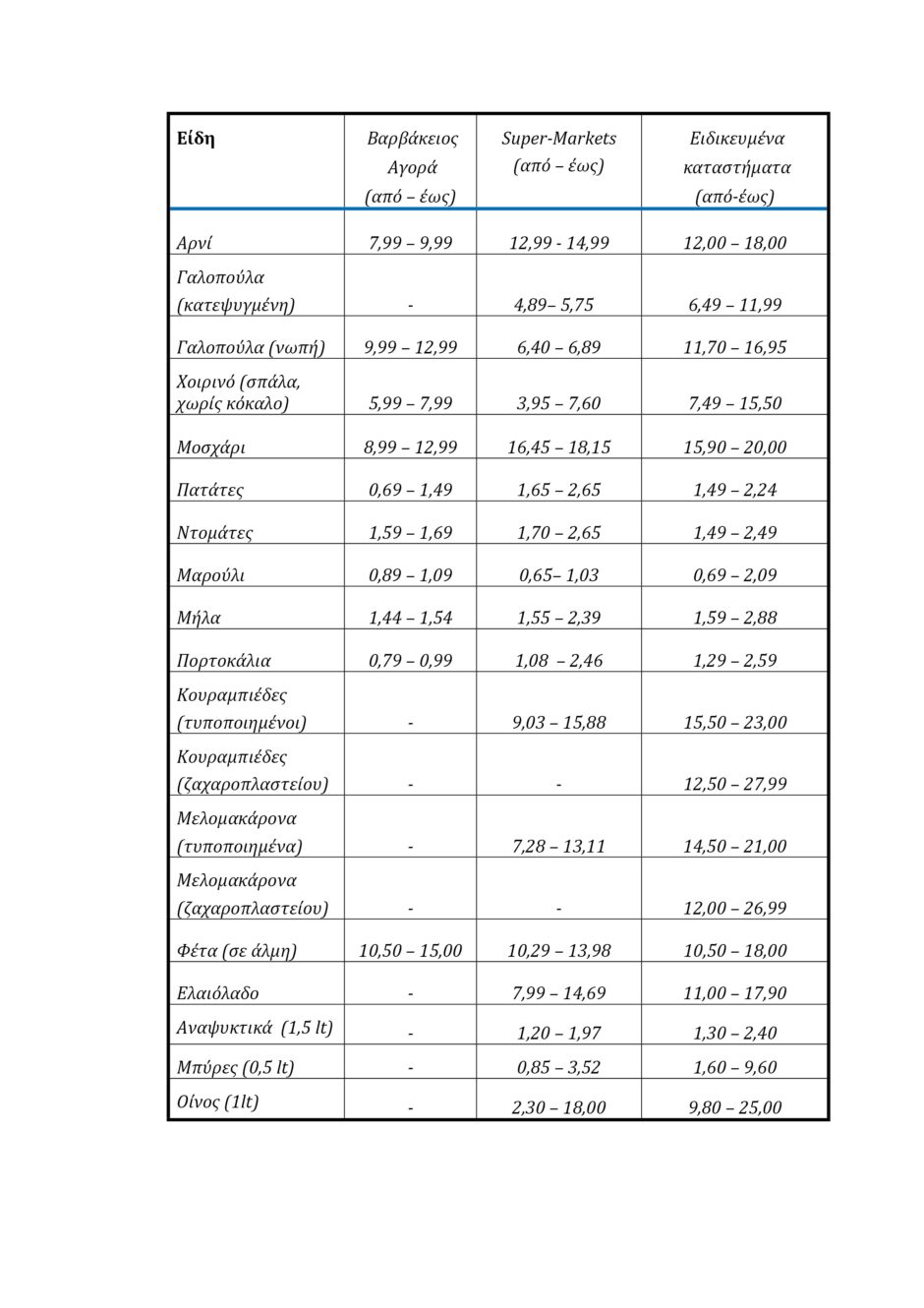 Το εύρος των τιμών δικαιολογείται από την καταγραφή σειράς προϊόντων διαφορετικής ποιότητας, σε αρκετές τοπικές αγορές και διαφορετικούς τύπους καταστημάτων. Επιπρόσθετα, διευκρινίζεται ότι οι τιμές των προϊόντων που εμφανίζονται στους Πίνακες (1 & 2) είναι ενδεικτικές και επιχειρούν να χαρτογραφήσουν τη γενική διάρθρωση τιμών και την εικόνα της αγοράς