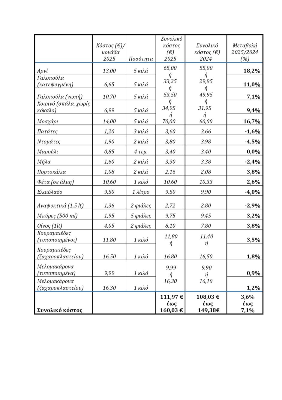 Πίνακας 1: Σύγκριση εκτιμήσεων κόστους χριστουγεννιάτικου τραπεζιού 2025 και 2024