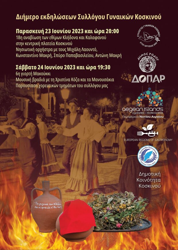 Ο Σύλλογος Γυναικών Κοσκινού συνδιοργανώνει διήμερο εκδηλώσεων στις 23 και 24 Ιουνίου 2023 στην κεντρική πλατεία Κοσκινού, με τον ΔΟΠΑΡ, την περιφέρεια Νοτίου Αιγαίου (τμήμα γαστρονομίας), την ομοσπονδία Πολιτιστικών Συλλόγων Ρόδου και τη Δημοτική Κοινότητα Κοσκινού.