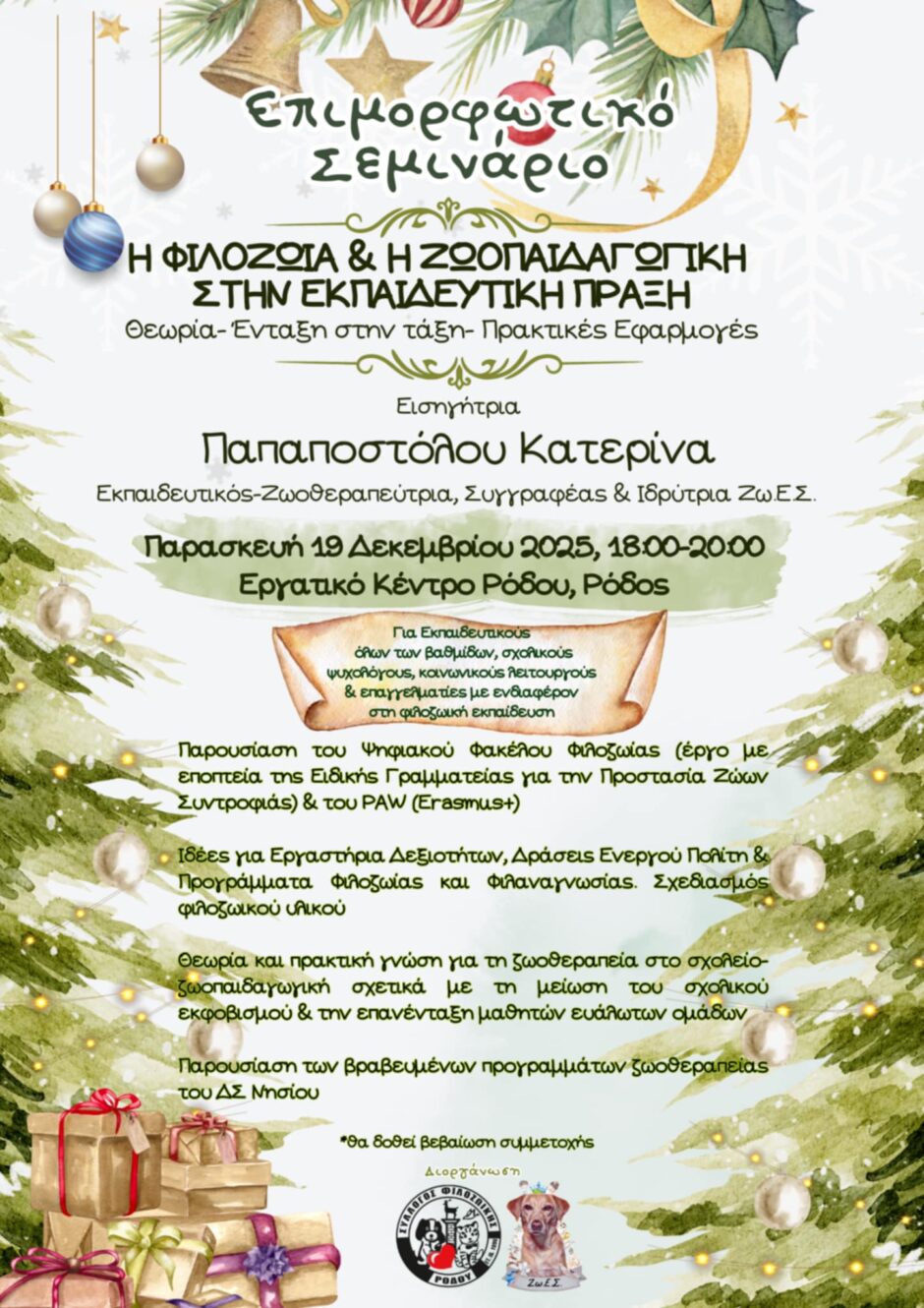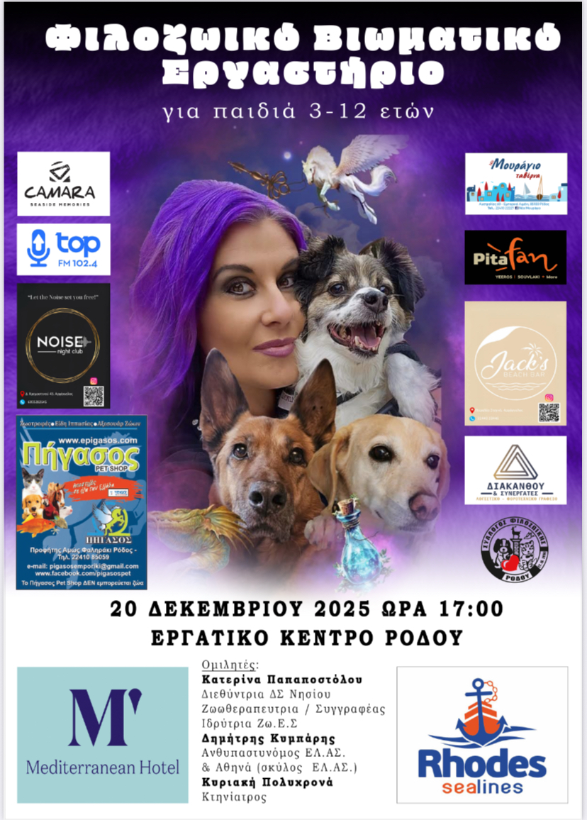 Ο Σύλλογος Φιλοζωικής Ρόδου διοργανώνει ένα ξεχωριστό Φιλοζωικό Βιωματικό Εργαστήριο για παιδιά ηλικίας 3 έως 12 ετών, το Σάββατο 20 Δεκεμβρίου 2025, στις 17:00, στο Εργατικό Κέντρο Ρόδου.