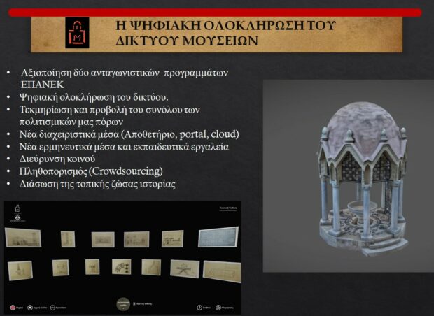 Τέλος, παρουσιάστηκε περιληπτικά το ψηφιακό επίτευγμα που αφορά τον ψηφιακό εκσυγχρονισμό και την «ψηφιακή ολοκλήρωση» του Δικτύου της Ιεράς Μητροπόλεως μέσα από την υλοποίηση δύο προγραμμάτων ΕΠΑΝΕΚ, Διαχείριση και προβολή του ψηφιακού περιεχομένου που αφορά το άυλο και υλικό πολιτιστικό και ιστορικό απόθεμα του μνημειακού συνόλου του Καθεδρικού Ιερού Ναού του Ευαγγελισμού της Θεοτόκου Ρόδου (ολοκληρωμένο) και Οργάνωση, ψηφιακή διαχείριση και προβολή του πολιτιστικού αποθέματος του Δικτύου Μουσείων και Επισκέψιμων Μνημείων της Ιεράς Μητροπόλεως Ρόδου (σε προχωρημένη φάση ολοκλήρωσης).