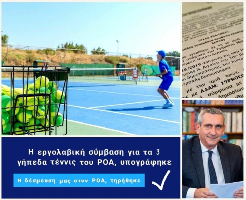 Ανακοίνωση με την οποία ευχαριστεί την Περιφέρεια Νοτίου Αιγαίου και ειδικότερα τον περιφερειάρχη Γιώργο Χατζημάρκο, για την κατασκευή τριών γηπέδων τένις, δύο στο «Έλλη» και ...