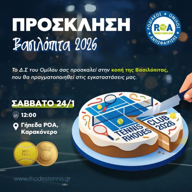 Το μεσημέρι του Σαββάτου 24 Ιανουαρίου, στις εγκαταστάσεις του στο Κορακόνερο, ο  Ροδιακός Όμιλος Αντισφαίρισης θα κόψει την βασιλόπιτά του.