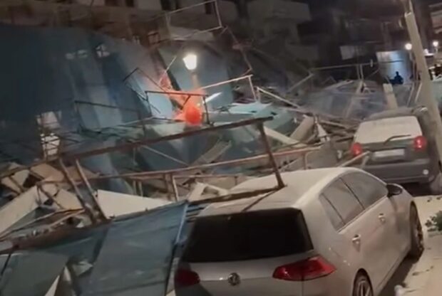 Ισχυροί άνεμοι που έπνεαν στο νησί συνέβαλαν στη μετατόπιση μεγάλου όγκου ικριωμάτων, τα οποία κατέληξαν στο οδόστρωμα και έπληξαν σταθμευμένα οχήματα, προκαλώντας εκτεταμένες υλικές ζημιές και θέτοντας ζήτημα ασφάλειας σε έναν δρόμο με αυξημένη κίνηση πεζών και οχημάτων.
