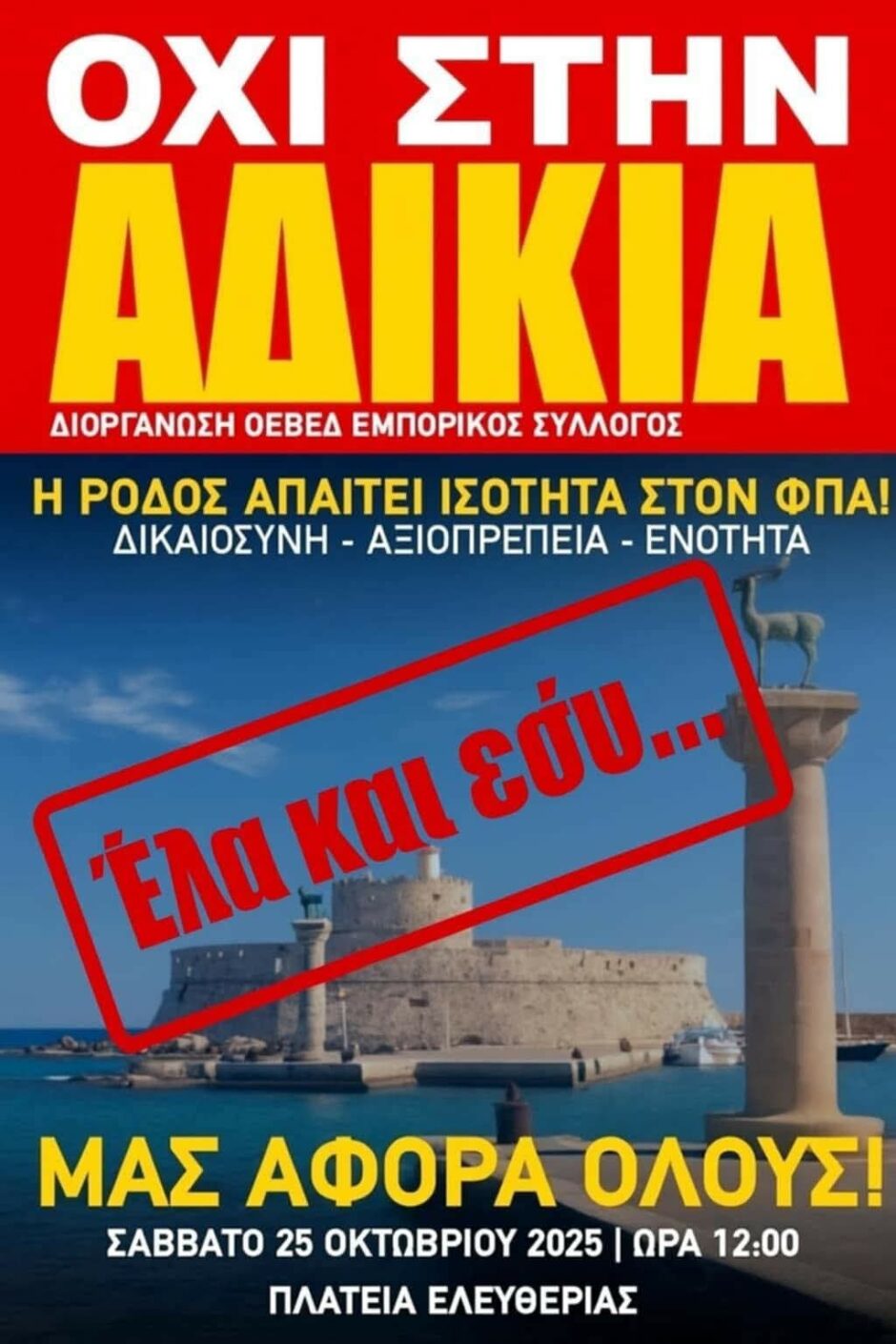 Συγκέντρωση διαμαρτυρίας θα πραγματοποιηθεί το Σάββατο 25 Οκτωβρίου για την εξαίρεση της Ρόδου από την επαναφορά των μειωμένων συντελεστών ΦΠΑ όπως εξαγγέλθηκαν από τον πρωθυπουργό για τα υπόλοιπα νησιά.