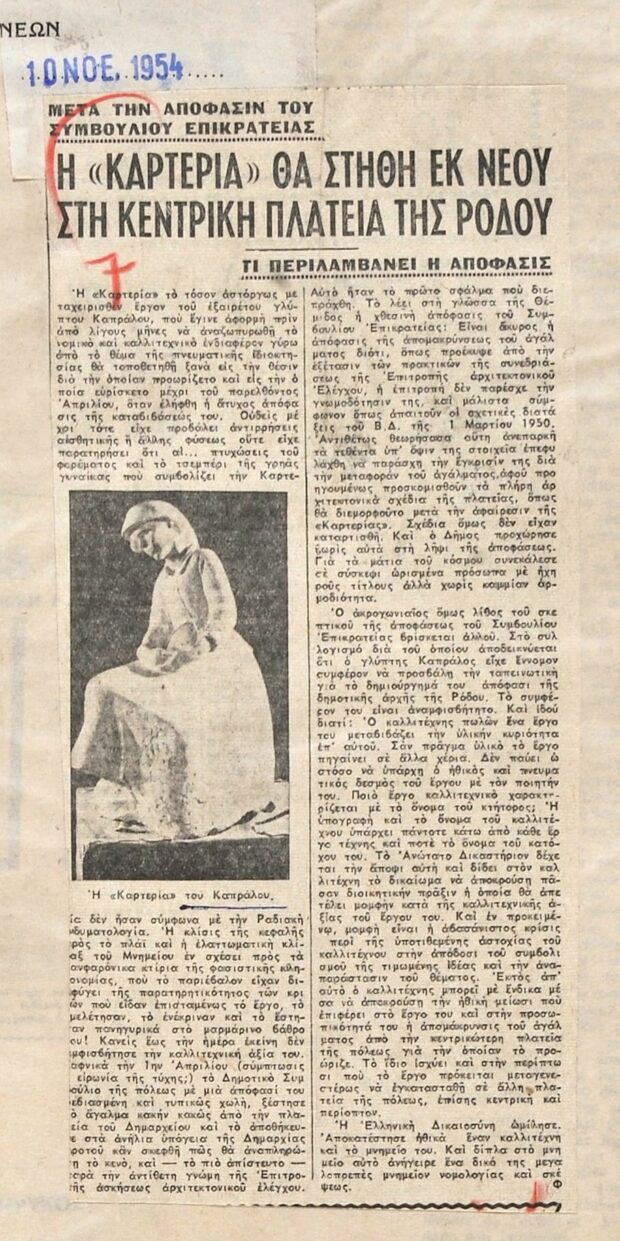Η μοναδική φωτογραφία από τα αποκαλυπτήρια, οδήγησε δεκαετίες αργότερα στη δημιουργία ενός ντοκιμαντέρ-έρευνας της Νατάσας Μπιζά, το οποίο παρουσιάζεται στην έκθεση «Changing Grounds» της Εθνικής Πινακοθήκης έως το 2026. Μια ιστορία μνήμης, τέχνης και διαγραφής έρχεται ξανά στο φως. Ο ίδιος ο Καπράλος προσέφυγε στο Συμβούλιο της Επικρατείας, το οποίο τον δικαίωσε το 1954, ζητώντας το άγαλμα να «αποφυλακιστεί» και να επανέλθει στην πλατεία του Δημαρχείου. Τελικά, η «Καρτερία» τοποθετήθηκε στο πάρκο απέναντι από τον Δημοτικό Κινηματογράφο «Ρόδον», διηγώντας την… υπομονή της από τους αρμοδίους… αναρμοδίους λογοκριτές τέχνης. Τα βάσανα όμως του γλυπτού του Καπράλου δεν τελειώνουν εδώ, καθώς το 2016 βάνδαλοι βεβήλωσαν με συνθήματα την Καρτερία και η Διεύθυνση Μεσαιωνικής Πόλης και Μνημείων σε συνεργασία με τη συντηρήτρια Νεκταρία Δασακλή ανέλαβαν την αποκατάστασή του.