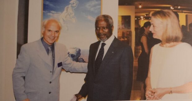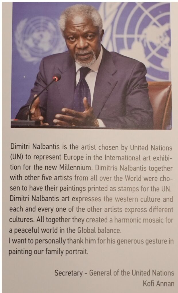 Το 10GR είναι ένα διαμάντι για τη Ρόδο, όμως αυτή είναι μια άλλη συζήτηση. Τα εγκαίνια της έκθεσης θα γίνουν την 1η Απριλίου 2026. Θα παρουσιαστούν πέντε έργα. Ένα από αυτά είναι το έργο που δημιούργησα για τα πενήντα χρόνια του ΟΗΕ. Είναι το πρώτο έργο που αναφέρεται στην Ελλάδα σε αυτό το πλαίσιο. Μάλιστα τιμήθηκε ιδιαίτερα. Παρουσιάστηκε από πρωθυπουργούς και αποτέλεσε κεντρικό σημείο σε μια μεγάλη παγκόσμια έκθεση ζωγραφικής που διοργάνωσε ο ΟΗΕ. Στην έκθεση συμμετείχαν χιλιάδες καλλιτέχνες από όλη την Ευρώπη. Από την Ελλάδα συμμετείχαν 188 επαγγελματίες ζωγράφοι, και εγώ κατέκτησα την πρώτη θέση για την Ελλάδα και την πρώτη για την Ευρώπη. Το έργο αυτό ταξίδεψε σε πολλά μέρη του κόσμου. Παρουσιάστηκε ακόμη και στο Παλάτι του Μπάκιγχαμ, στο St. James’s Palace, στο Λονδίνο. Αργότερα έφτασε στα κεντρικά γραφεία του ΟΗΕ, όπου βραβεύτηκα μαζί με άλλους πέντε καλλιτέχνες από τον τότε Γενικό Γραμματέα, τον Κόφι Ανάν.