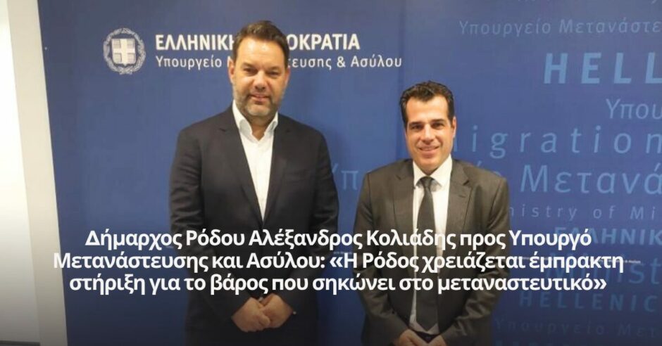 Σε ιδιαίτερα θετικό κλίμα πραγματοποιήθηκε στην Αθήνα η συνάντηση του Δημάρχου Ρόδου Αλέξανδρου Κολιάδη με τον Υπουργό Μετανάστευσης και Ασύλου Θάνο Πλεύρη.