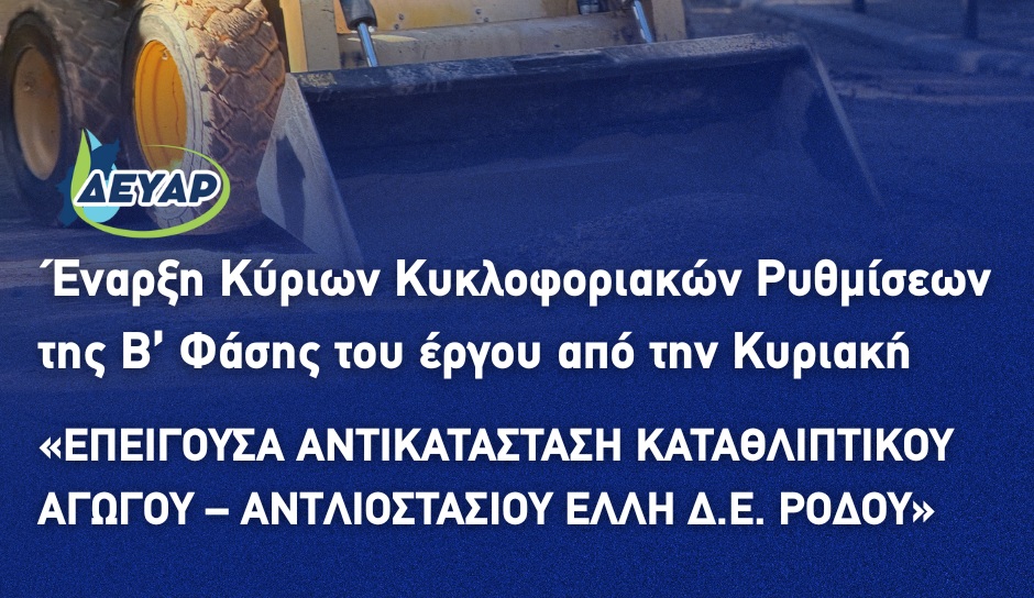 Ενημερώνουμε τουs Δημότες ότι από Κυριακή 23 Νοεμβρίου 2025 και ώρα 06:00, τίθενται σε εφαρμογή οι κύριες προσωρινές κυκλοφοριακές ρυθμίσεις της Β’ Φάσης, οι οποίες απαιτούνται για την ασφαλή συνέχιση των εργασιών στους κεντρικούς οδικούς άξονες της πόλης.