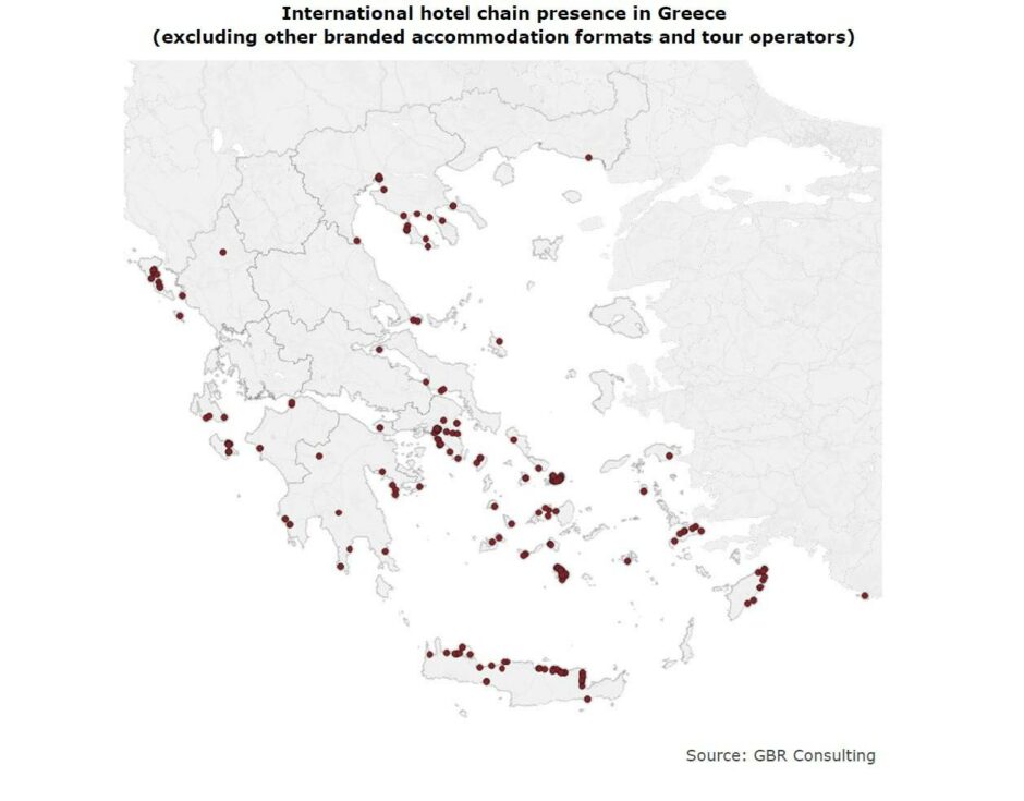 Αξίζει επίσης να σημειωθεί ότι, σύμφωνα με την GBR Consulting, συνολικά το 8% όλων των ξενοδοχείων στην Ελλάδα και το 22% των ξενοδοχειακών δωματίων ανήκουν πλέον σε κάποια επώνυμη αλυσίδα — διεθνή, εθνική ή τοπική. Η έννοια της αλυσίδας αφορά οποιαδήποτε ομάδα δύο ή περισσότερων ξενοδοχείων που λειτουργούν υπό κοινή εταιρική ταυτότητα, εμφανή στον επισκέπτη. Αντιθέτως, καταλύματα που λειτουργούν από την ίδια εταιρεία χωρίς ενιαίο brand δεν καταγράφονται ως αλυσίδες, ενώ από την ανάλυση εξαιρούνται οι τουριστικοί οργανισμοί.