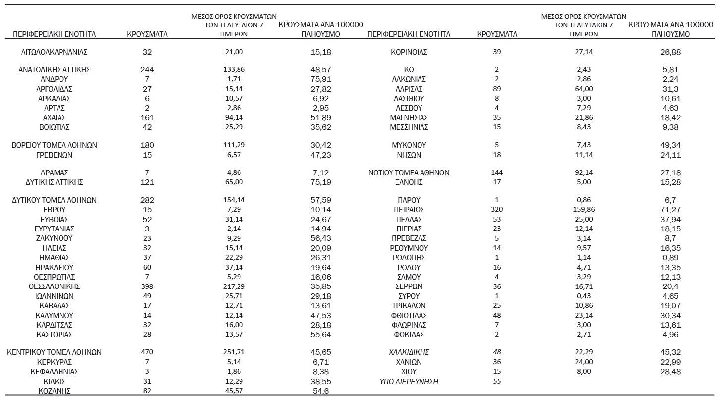 Κατανομή ανακοινωθέντων εγχώριων κρουσμάτων: Από το σύνολο των 3.586 νέων κρουσμάτων του νέου ιού στη χώρα 12 είναι εισαγόμενα εκ των οποίων 10 εντοπίστηκαν κατόπιν ελέγχων στις πύλες εισόδου της χώρας. Η κατανομή των 3.574 νέων εγχώριων κρουσμάτων ανά Περιφερειακή Ενότητα παρουσιάζεται στον κατωτέρω πίνακα: