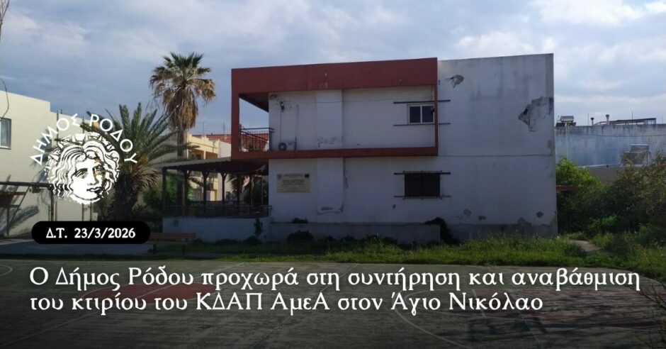 Ο Δήμος Ρόδου προχωρά στη συντήρηση και λειτουργική αποκατάσταση του κτιρίου του ΚΔΑΠ ΑμεΑ στην περιοχή του Αγίου Νικολάου, με προϋπολογισμό 330.000 ευρώ, που θα καλυφθεί από ίδιους πόρους και μέσω της ΣΑΤΑ.