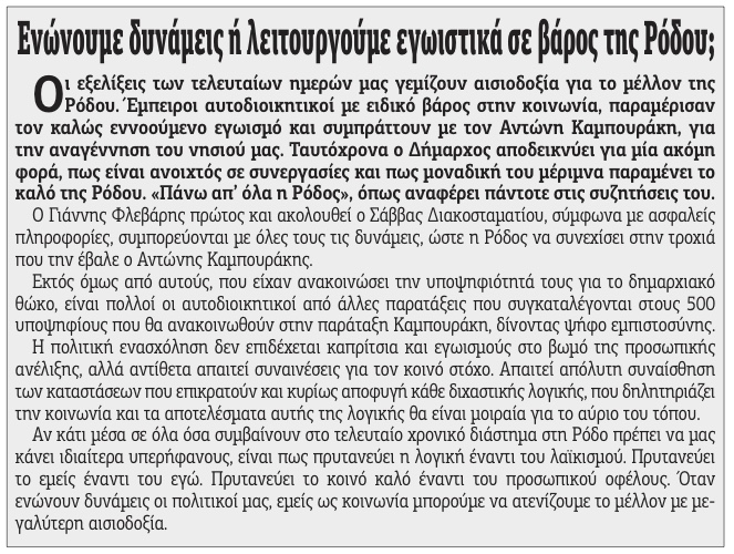 Οι μοναχικοί δρόμοι, ο ατομισμός και η προσωποποίηση των αντιθέσεων δεν είναι τακτικές που εκφράζουν το νέο αυτοδιοικητικό σχήμα που έχει βρεί κοινή συνισταμένη για το πως θα πετύχει τον στόχο «Για μια Ρόδο που λάμπει».