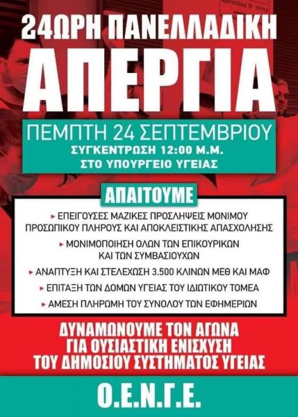 Κλιμακώνουμε με 24ωρη πανελλαδική απεργία την Πέμπτη 24/9! Μέτρα τώρα για την προστασία της υγείας του λαού, για την ουσιαστική ενίσχυση του δημόσιου συστήματος Υγείας.