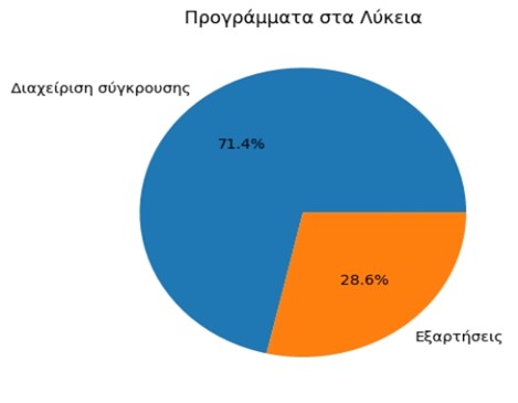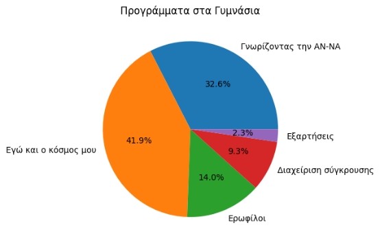 Στα Γυμνάσια πραγματοποιήθηκαν 43 δράσεις δυο και τριών συναντήσεων, (1145 μαθητές) με κυρίαρχα εκπαιδευτικά προγράμματα :