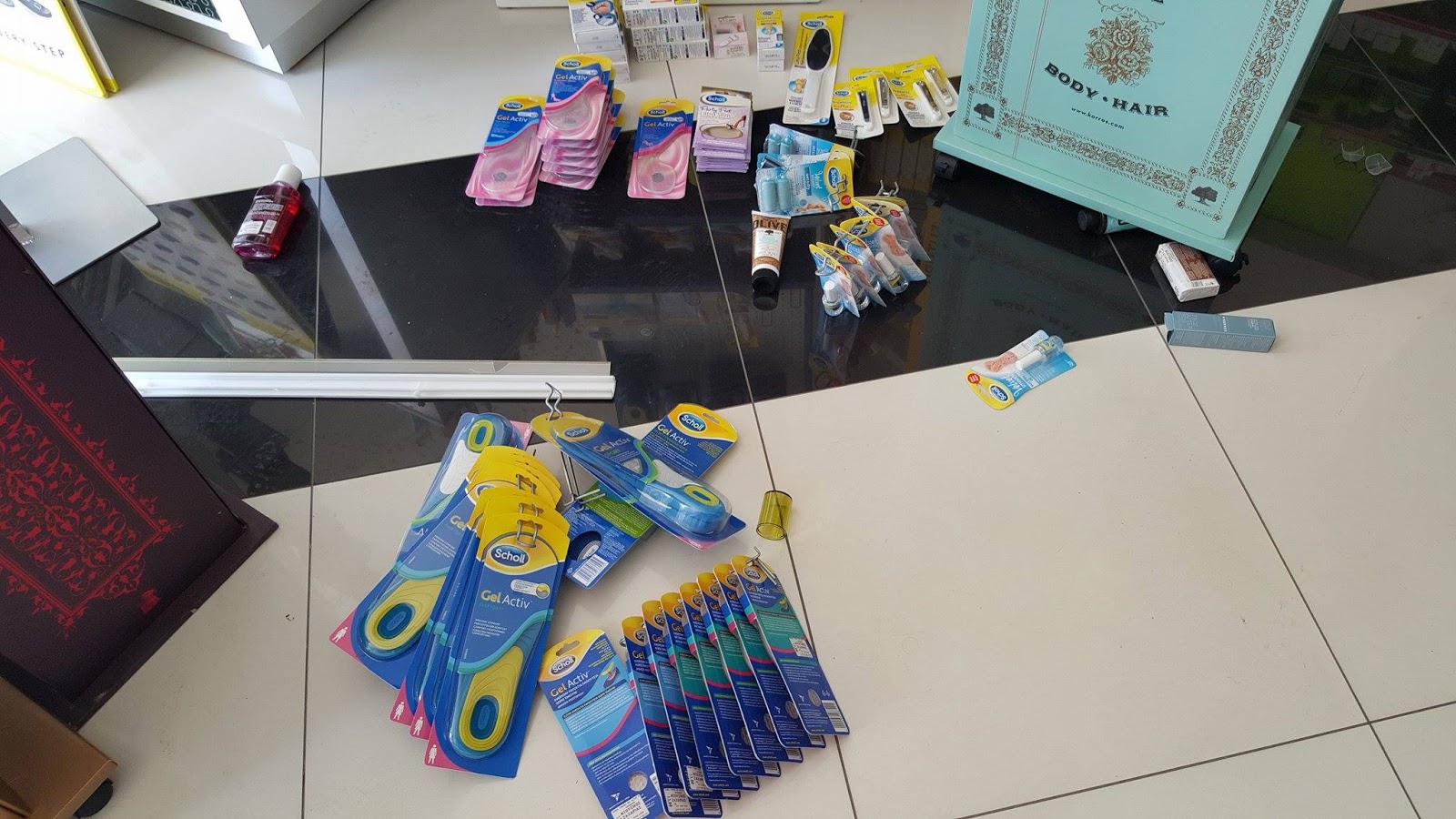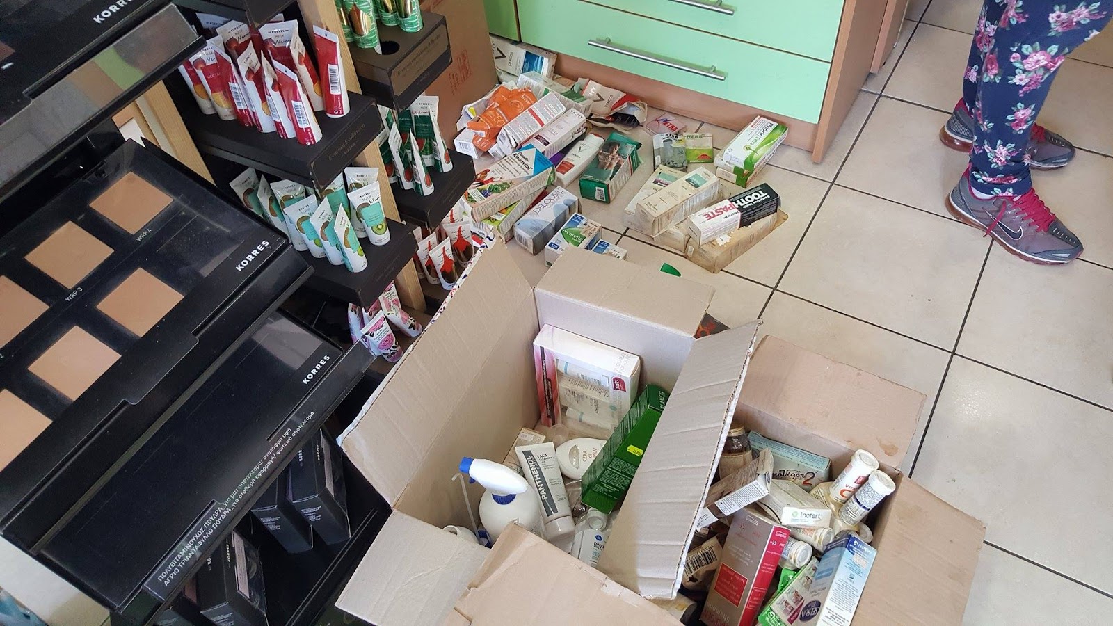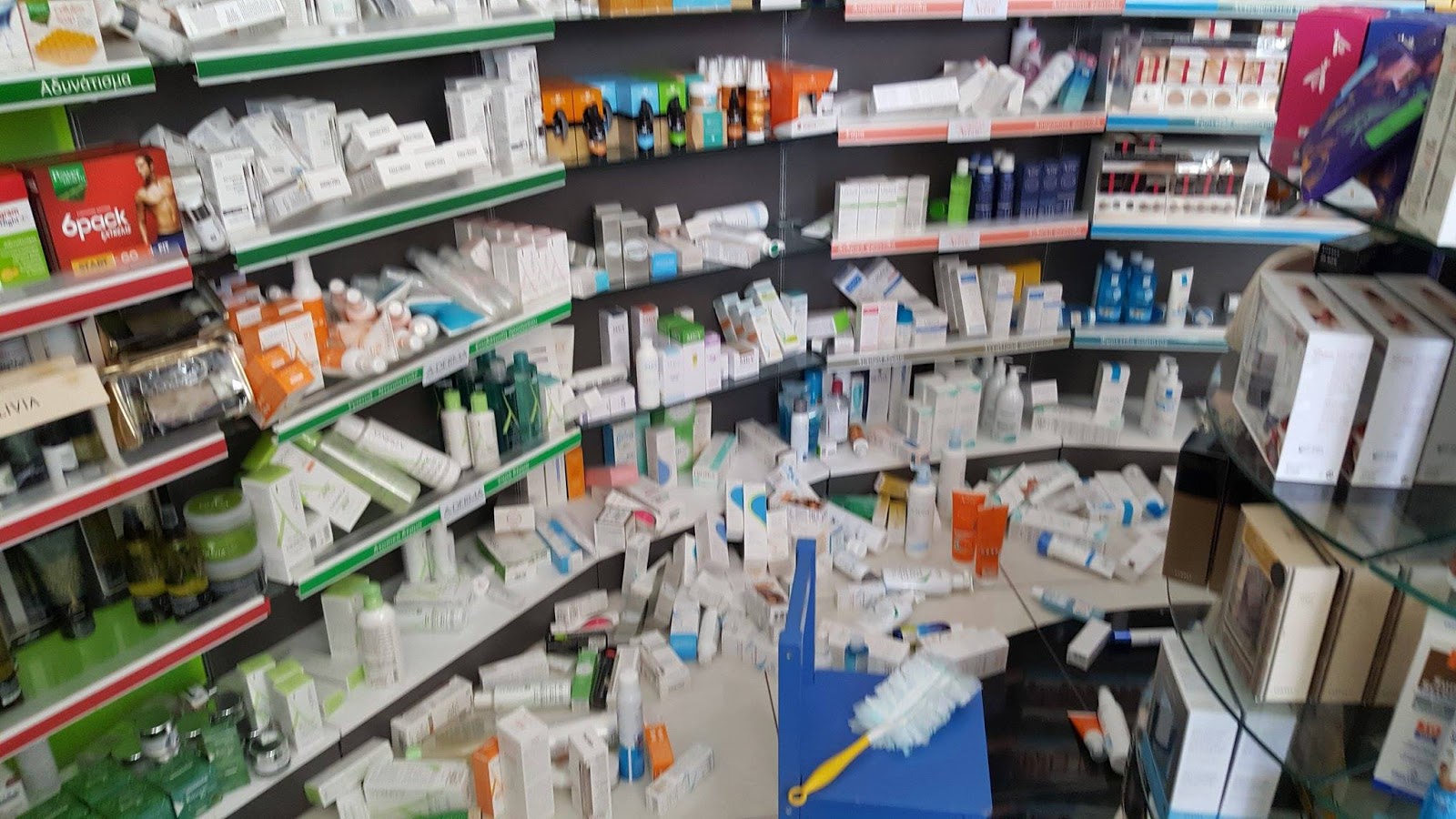 Σχετικά μικρής σημασίας είναι επίσης το ζήτημα των κατεστραμμένων προϊόντων , σε σχέση με το μέγεθος και την ένταση του φυσικού φαινομένου. Δεδομένου πως σχεδόν από όλα τα φαρμακεία, περίπου όλα τα εμπορεύματα (ακόμα και μέσα από τα συρτάρια) έπεσαν στο πάτωμα, τελικά μάλλον μικρό μέρος από αυτά είναι πλέον ακατάλληλα για πώληση.