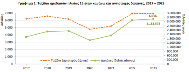 Το σύνολο των διανυκτερεύσεων των ατόμων αυτών κατά το 2023 ανήλθε σε 66,0 εκατομμύρια και οι δαπάνες σε 3.182,7 εκατομμύρια ευρώ, σημειώνοντας μείωση 3,8% και αύξηση 2,8%, αντίστοιχα, σε σύγκριση με τα στοιχεία του έτους 2022.
