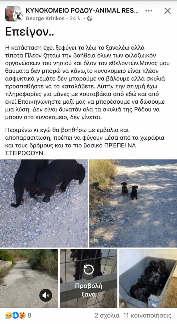 «Δεν πάει άλλο με τις εγκαταλείψεις των σκυλιών. Η κατάσταση έχει ξεφύγει. Το Κυνοκομείο Ρόδου είναι ασφυκτικά γεμάτο!