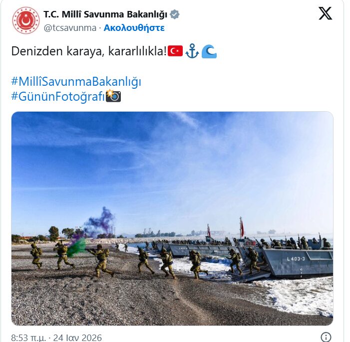 Το Υπουργείο Άμυνας της Τουρκίας κοινοποίησε στον επίσημο λογαριασμό του στην πλατφόρμα X μια φωτογραφία που απεικονίζει Τούρκους στρατιώτες κατά τη διάρκεια επιχείρησης απόβασης από τη θάλασσα στην ξηρά. Η εικόνα, η οποία έφερε τον τίτλο «Από τη θάλασσα στη στεριά, με αποφασιστικότητα!», προκάλεσε «πλημμύρα» από θετικά σχόλια και likes, με τα τουρκικά ΜΜΕ να συνδέουν άμεσα το υλικό με τις προετοιμασίες των Ενόπλων Δυνάμεων για πιθανές έκτακτες ανάγκες στην ευρύτερη περιοχή.