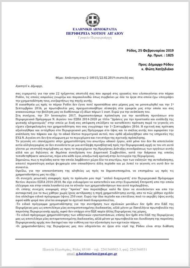 Ο Περιφερειάρχης Νοτίου Αιγαίου, Γιώργος Χατζημάρκος, με επιστολή του προς τον Δήμαρχο Ρόδου, απαντά στην από 22/02.2019 επιστολή του Φώτη Χατζηδιάκου, σχετικά με το Πάρκο Ροδίνι και τη χρηματοδότηση των εργασιών ανάπλασής του, την οποίαν ο Περιφερειάρχης χαρακτηρίζει ως απαράδεκτη και προσβλητική παρέμβαση στη λειτουργία της Περιφέρειας και των οργάνων της, επισημαίνοντας παράλληλα ότι η Περιφερειακή Αρχή σέβεται απολύτως τον διακριτό ρόλο του καθενός, διατηρώντας το αποκλειστικό δικαίωμα στην λήψη των τελικών αποφάσεων στα ζητήματα ευθύνης της.