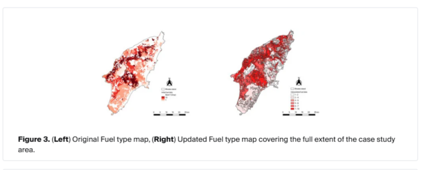 Πιο εξειδικευμένες αναλύσεις για τη Ρόδο επιτρέπουν μια λεπτομερή αποτύπωση της κατάστασης. Εκτιμάται ότι περίπου το 93% της επιφάνειας του νησιού παρουσιάζει υψηλή οικολογική ευπάθεια, λόγω της συνύπαρξης εκτεταμένων δασικών εκτάσεων, αγροτικής δραστηριότητας και φυσικών οικοσυστημάτων με υψηλή συσσώρευση καύσιμης ύλης.