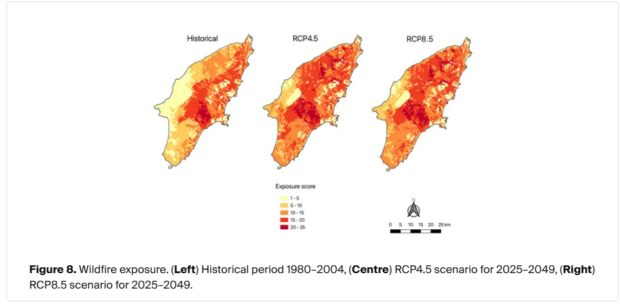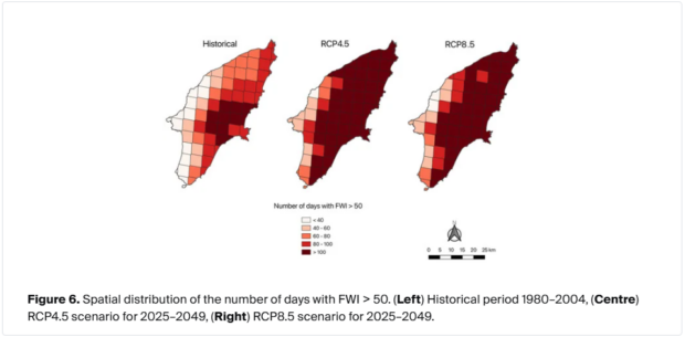 Παράλληλα, οι προβολές δείχνουν ότι οι περιοχές που εκτίθενται σε συνθήκες ακραίου κινδύνου (FWI > 50) αυξάνονται σημαντικά, από το ιστορικό 15,19% σε έως και 66–72% της συνολικής έκτασης. Στην πράξη, αυτό σημαίνει ότι μεγάλο μέρος του νησιού θα βρίσκεται συστηματικά σε συνθήκες όπου μια εστία φωτιάς μπορεί να εξελιχθεί ταχέως σε εκτεταμένο μέτωπο.