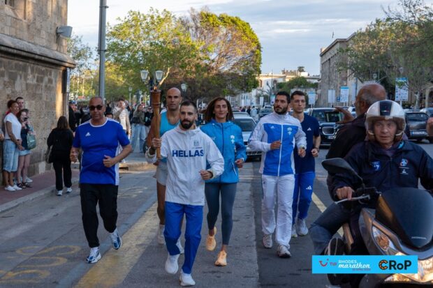 Ο κορυφαίος Έλληνας δρομέας, ο Παναγιώτης Καραΐσκος άναψε τη Φλόγα της της Καλλιπάτειρας, μπροστά από το Δημαρχείο της Ρόδου.