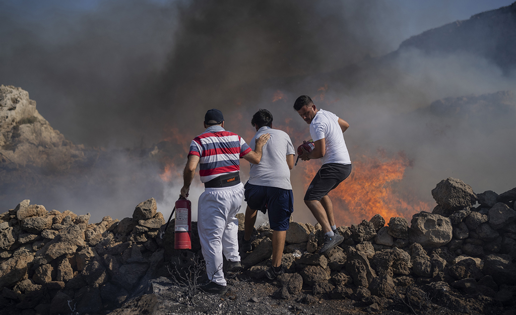 Φωτογραφία A.P. Photo / Petros Giannakouris -Aνδρες προσπαθούν να σβήσουν τις φλόγες με πυροσβεστήρες στη Λίνδο